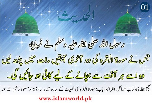 Rasool ALLAH p.b.u.h nay farmaya jis nay sura e bakra ki 2 aakhri ayatain raat main parh leen wo usay har aafat say bachanay keliye kaafi ho jayain gi (sahih bukhari)